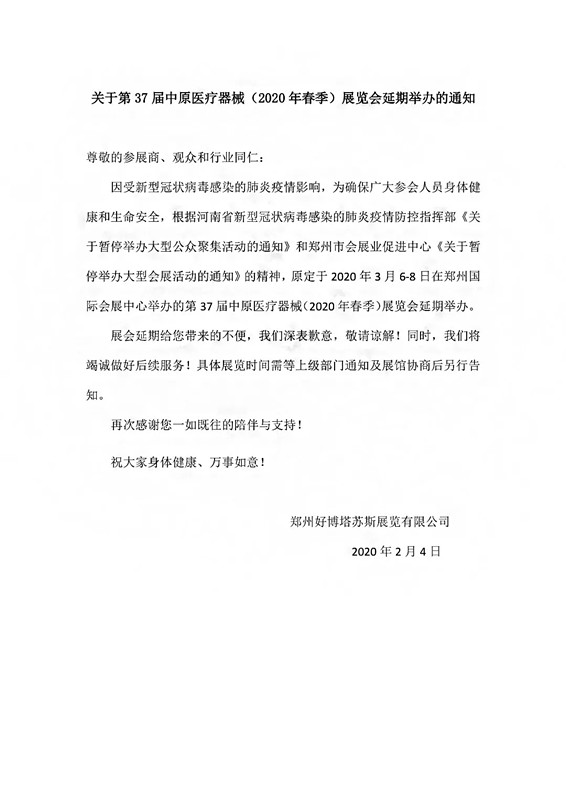 關(guān)于第37屆中原醫(yī)療器械(2020年春季)展覽會(huì)延期舉辦的通知,原定于3月6-8日,推遲到8月3-日在鄭州國際會(huì)展中心舉辦。